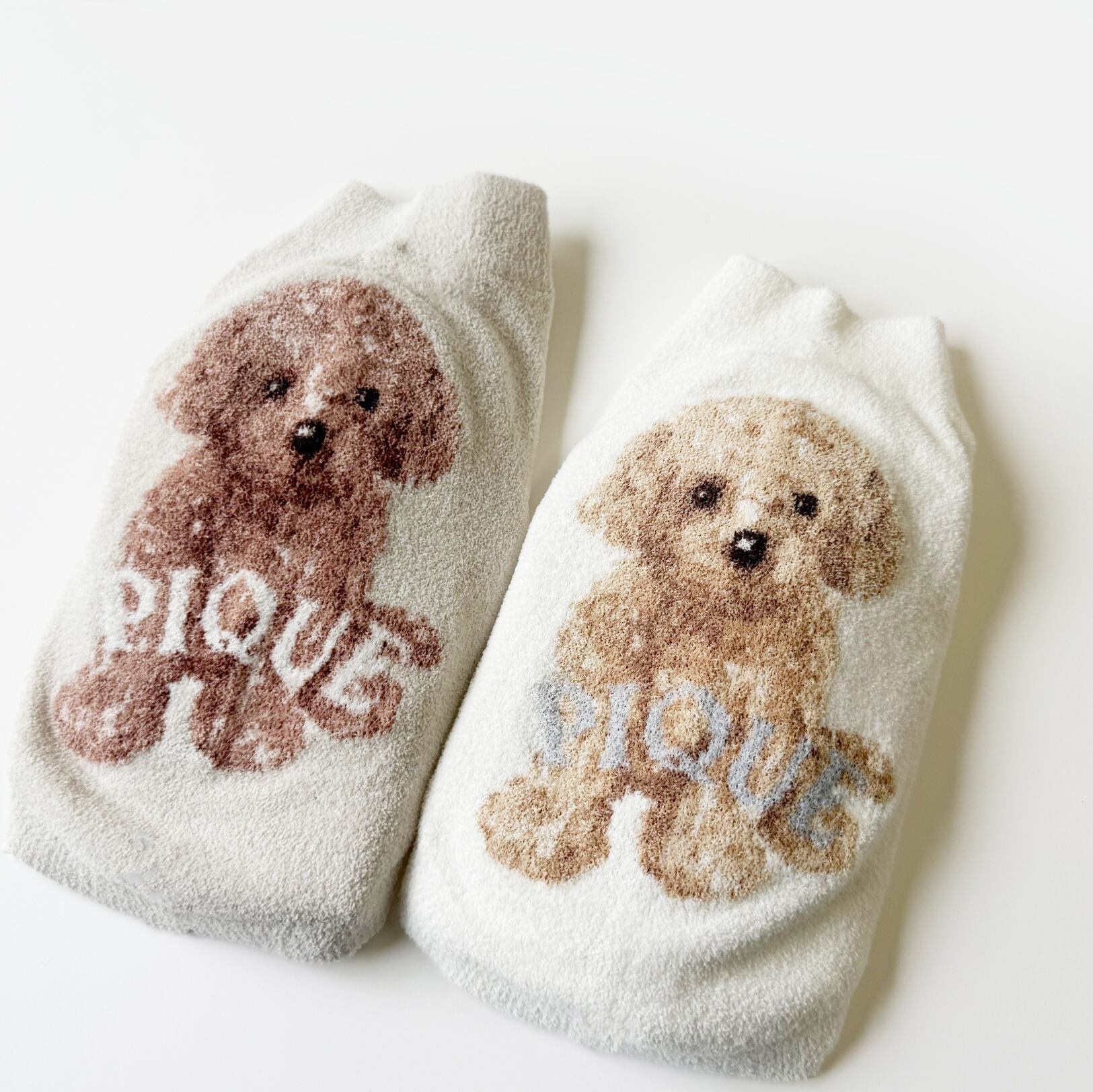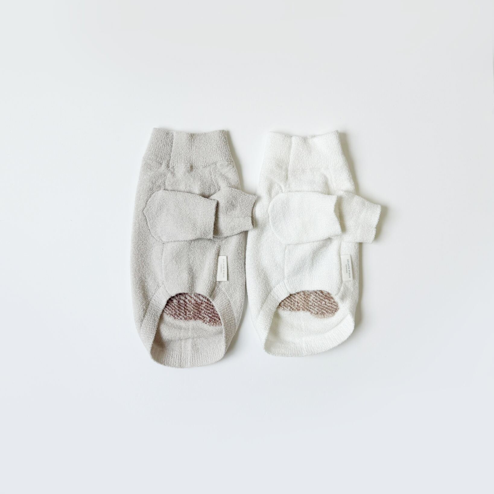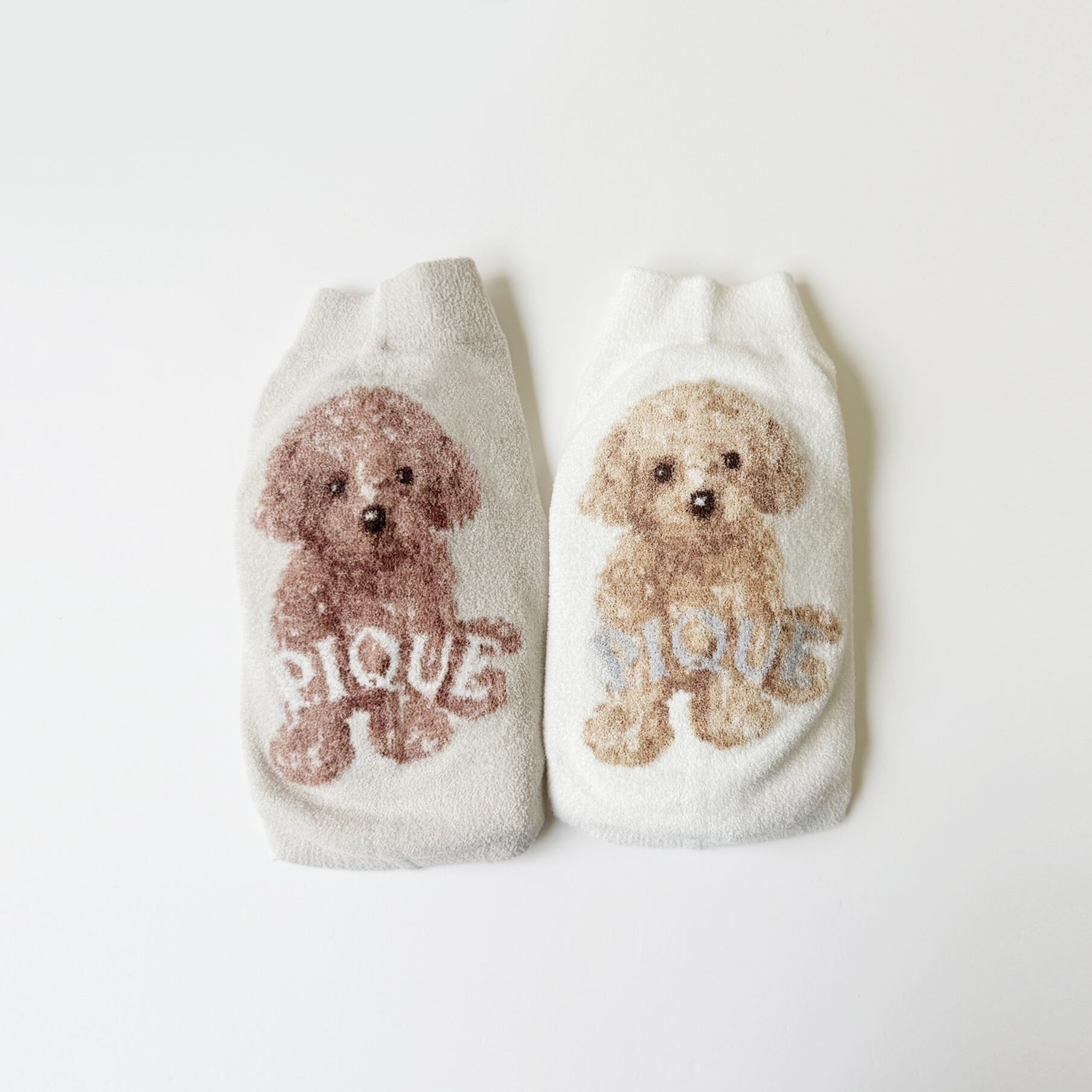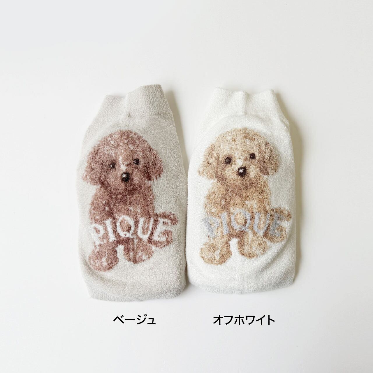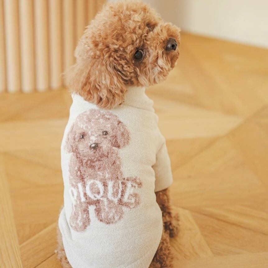 キュートなお座りポーズのトイプードルを描いた、オーナーさんとお揃いコーディネートを楽しめるハイネックの長袖プルオーバーです。こちらを見つめる大きなトイプードルの絵柄に、アーチロゴを組み合わせたキャッチーなジャガード柄。小型犬全般に着用いただけるサイズ感です。色はオフホワイトとベージュの2色をご用意。オーナーさんのルームウェアとのリンクコーディネートもお楽しみください。