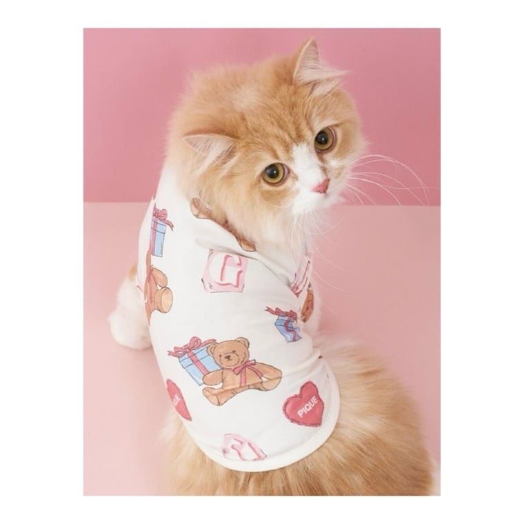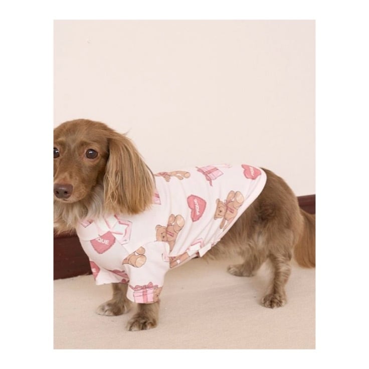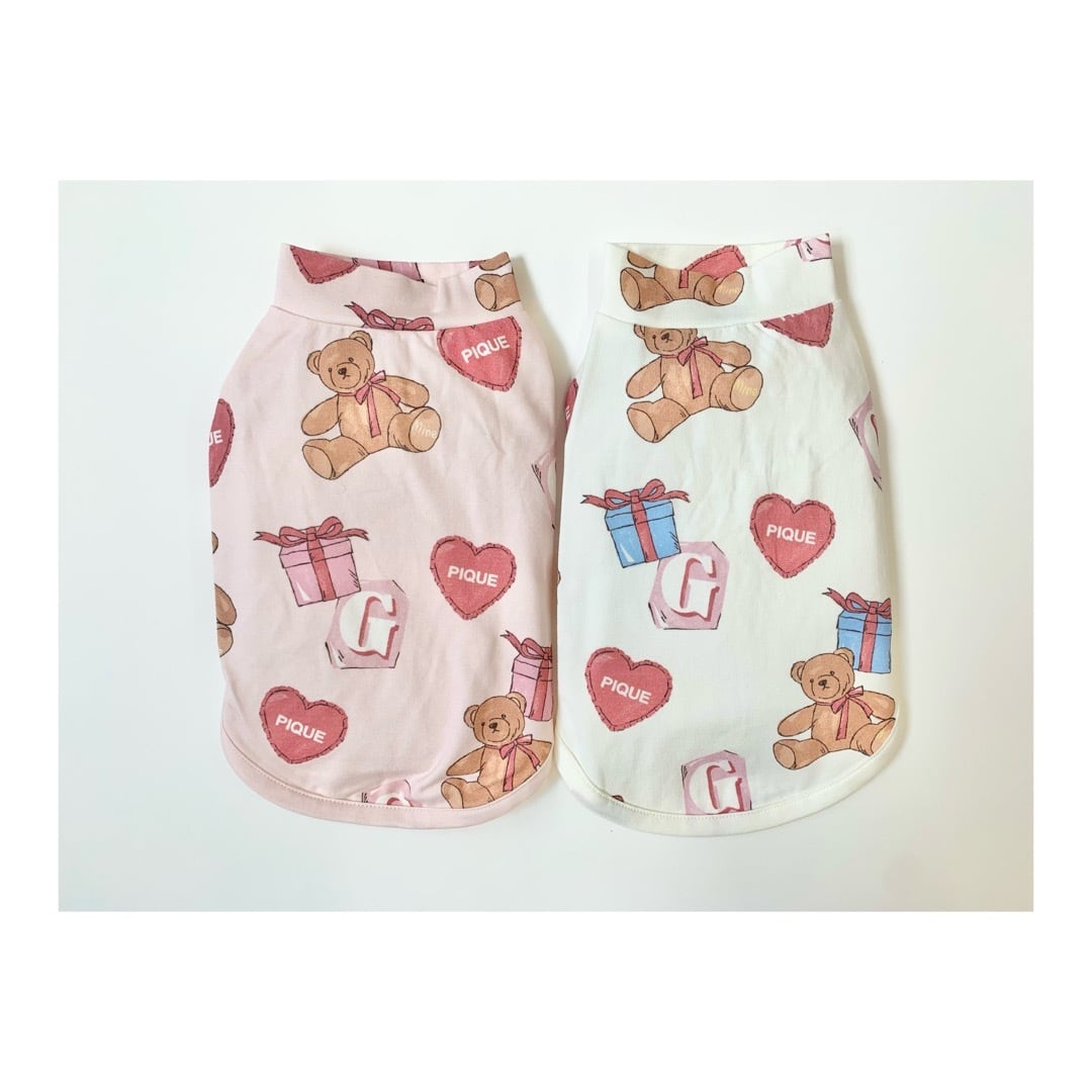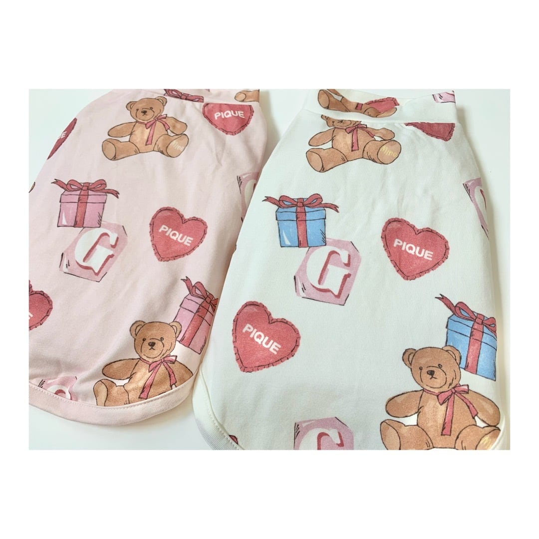 お気に入りのベアのぬいぐるみと暮らす、女の子のキュートなお部屋をイメージしたプリントカットソーのシリーズです。ベアのぬいぐるみとギフトボックス、ハートのクッション、雑誌から切り抜いた『G』を総柄プリントしたプルオーバー。適度な厚みのカットソーなので季節を問わず着用いただけます。色はオフホワイトとピンクの2色展開。オーナー様のルームウェアとお揃いで着用いただけるアイテムです。