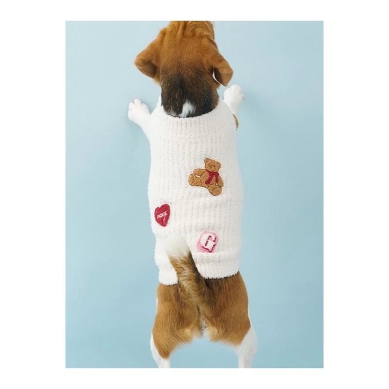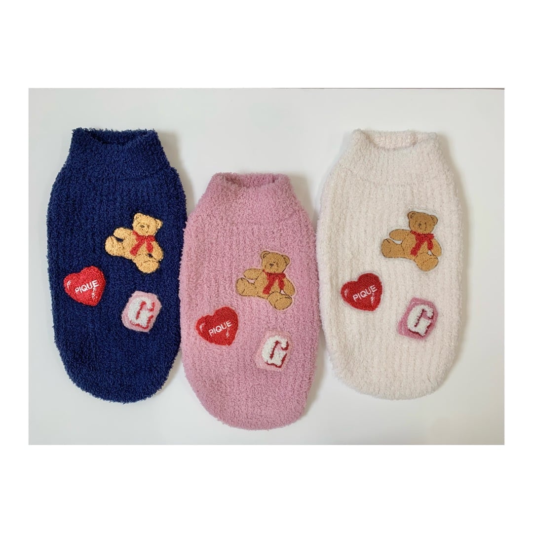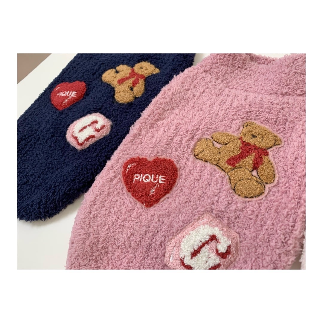 お気に入りのベアのぬいぐるみと暮らす、女の子のキュートなお部屋をイメージしたシリーズです。もっちり柔らかい‘ベビモコ’を畦編みにして使用したプルオーバー。背中にはベアのぬいぐるみとハートのクッション、雑誌から切り抜いたような『G』のサガラワッペンを施しました。色はアイボリー、ピンク、ネイビーの3色展開。オーナー様のルームウェアとお揃いで着用いただけるアイテムです。