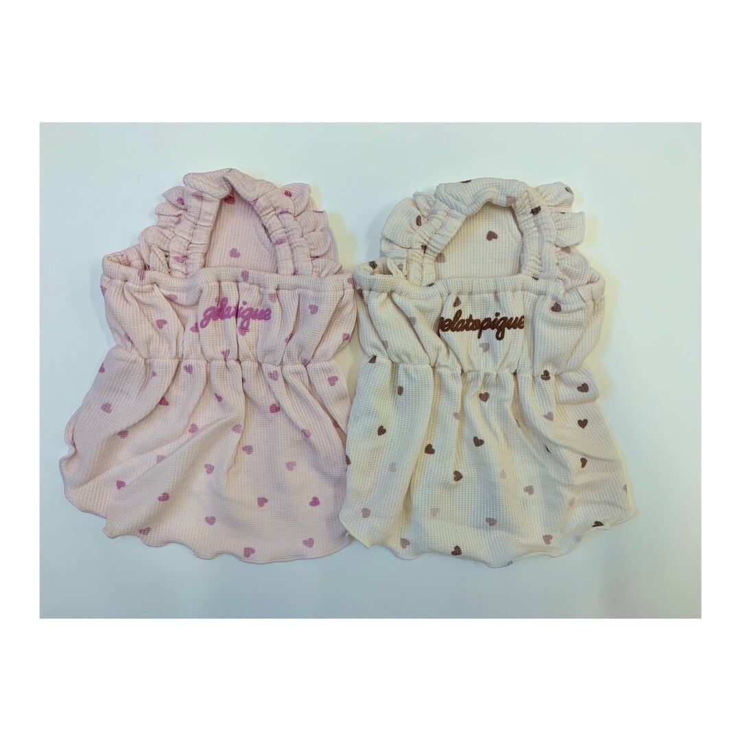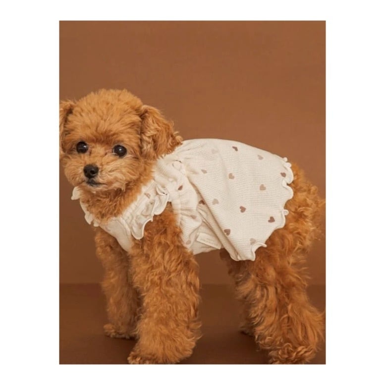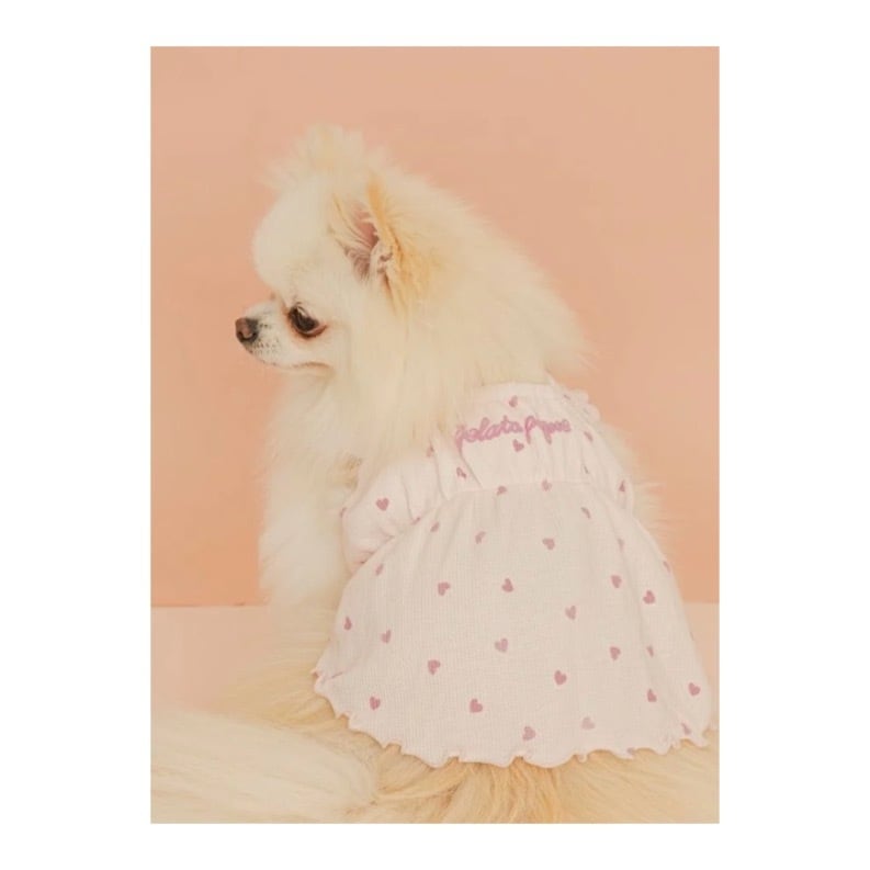 軽やかな肌触りのワッフル生地に、ちびちびハートのプリントを散りばめたガーリーなワンピースです。肩にフリル、裾にメローを入れた愛らしいシルエットで、背中にぷっくりと立体的なブランドロゴが入っています。お腹周りや肩紐にギャザーを入れているので、愛犬が動きやすく、着脱もスムーズ。色はピンクとアイボリーの2色展開です。きょうだいで色違いを揃えるのもおすすめ。同シリーズのハート型のトイとコーディネートしてお楽しみいただけます。