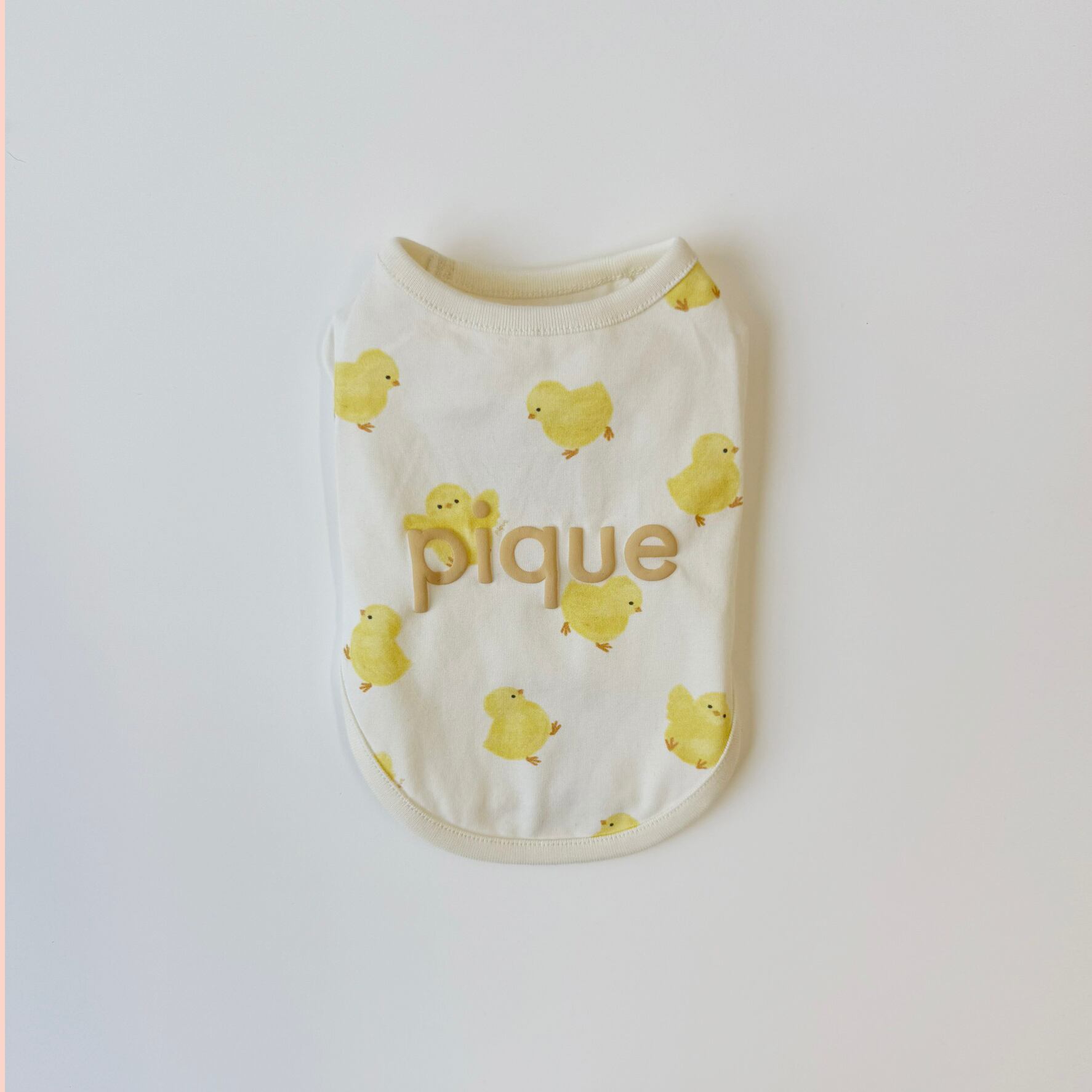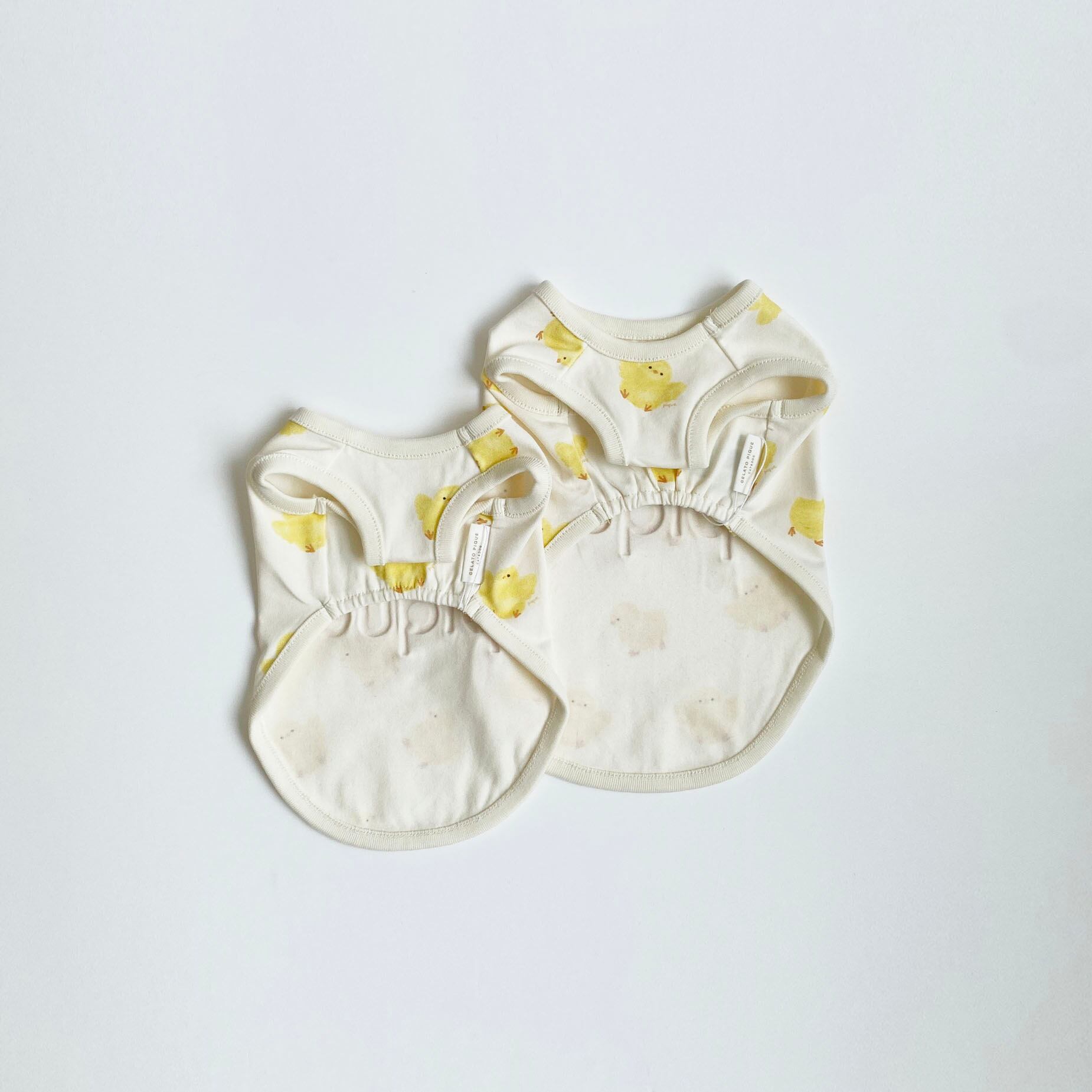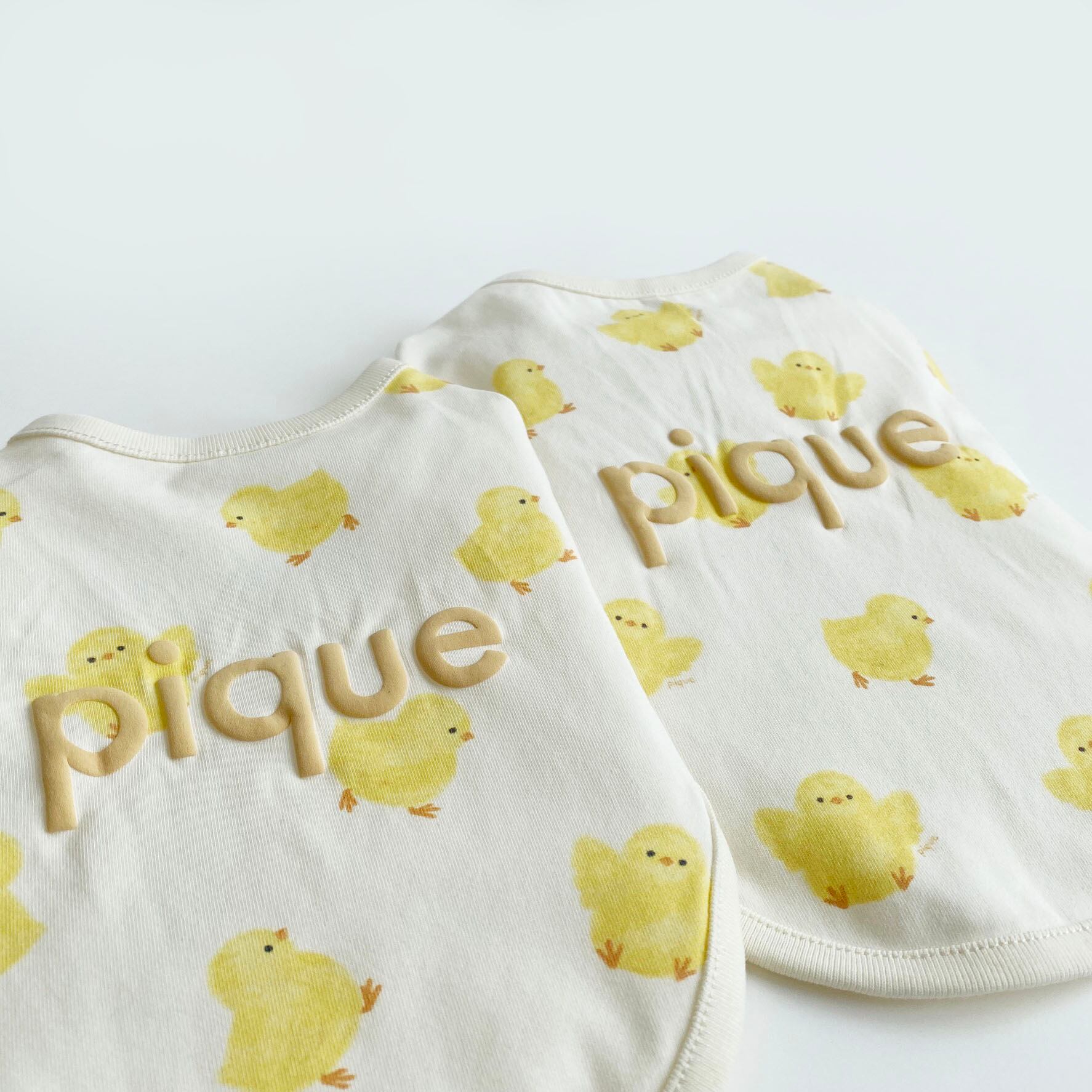 羽を広げたり、よちよち歩くひよこたちのプリント柄がキュートな犬、猫用プルオーバーです。柔らかな着心地のカットソーなので、1年を通して着用いただけるアイテム。背中には発泡プリントでぷっくりとしたロゴをデザインしました。同シリーズのKIDS、BABYルームウェアもご用意しています。